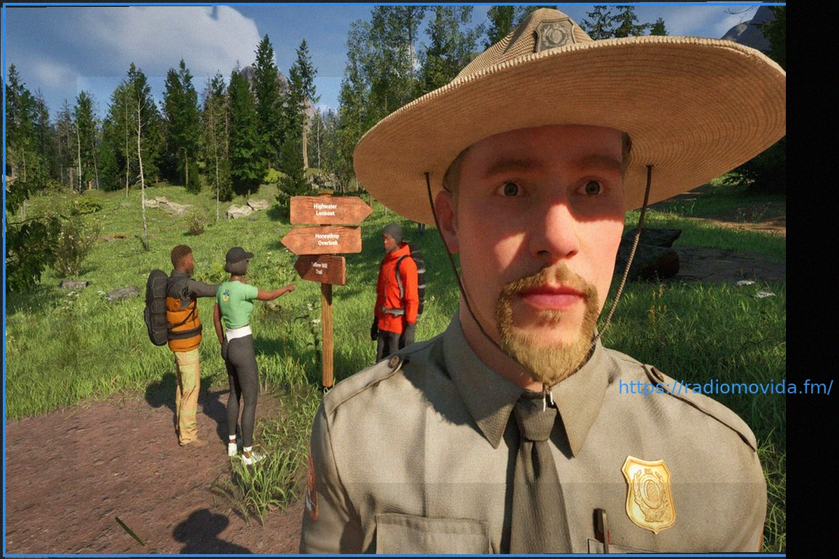 (Image context: A park ranger is depicted near a sign, with hikers visible in the background, illustrating the setting of their work.)