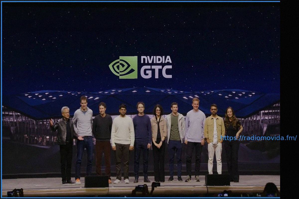 Il CEO di Nvidia, Jensen Huang, è stato visto sul palco, affiancato da diversi altri importanti CEO di aziende di IA, tutti riuniti sotto un banner Nvidia GTC.